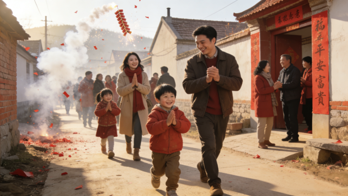 这个欢天喜地的日子,是在爆竹声中开启的。古书中说,初一庭前的爆竹,是用来劈山臊恶鬼的。然而,我乡人却常将其看作幸福的起点。
